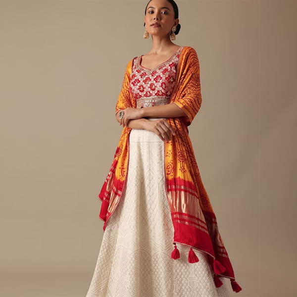 White, red & yellow Embroidered ready to wear lehenga, has drawstring closure